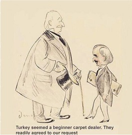 Lord Curzon ile İsmet İnönü'yü tasvir eden karikatür. 27.12.1923 Daily Telegraph. Altında şöyle yazıyor Türkler, acemi bir halı satıcısı gibiydi; ne istediysek kabul etti.